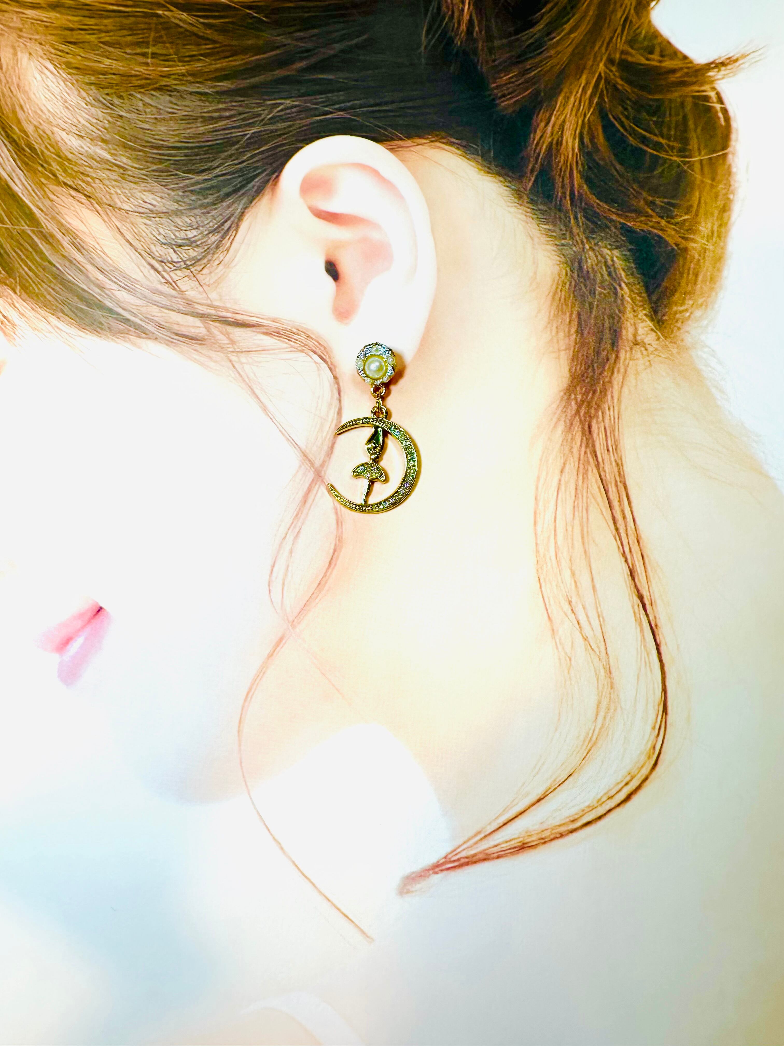 パール付きゴージャスゴールドの月で踊るバレリーナピアス